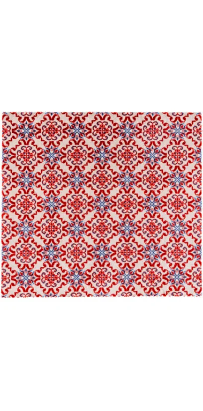 De Pallazo-print is geïnspireerd op klassieke Mediterrane tegelmotieven, zoals je die ziet in Italiaanse palazzo’s en Zuid-Europese stadshuizen. Het ornamentale patroon, gecombineerd met de warme roodtinten en verfijnde blauwe accenten, geeft de mat een luxe en decoratieve uitstraling.